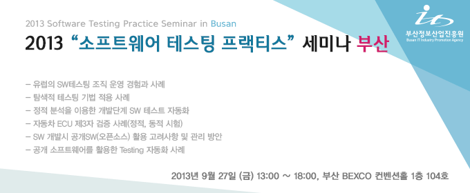 제 목 | : 2013 소프트웨어 테스팅 프랙티스 세미나 부산 | 주 최 | : 부산정보산업진흥원 | 주 관 | : 동남권 SW품질역량센터, STA테스팅컨설팅 | 일 시 | : 2013년 9월 27일 (금) 13:00 ~ 17:30 | 장 소 | : 부산 벡스코 컨벤션홀 1층 104호 |  |